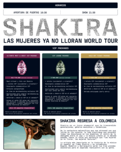 • Meet & Greet y foto con Shakira. El M&G podrá realizarse antes de que inicie el show o despues del show. No se permitirán artículos autografiados durante el Meet & Greet. No se permitirán celulares o regalos. Toda la información respecto del Meet & Greet será comunicada por el organizador del evento antes del día del evento, quien es el único responsable por las características, información y comunicación de estos beneficios.